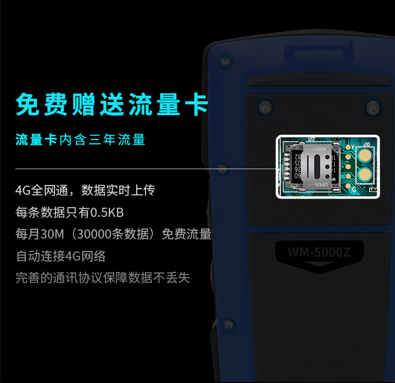 4G全網(wǎng)通,數(shù)據(jù)實時上傳每條數(shù)據(jù)只有0.5KB每月30M(30000條數(shù)據(jù))免費(fèi)流量自動連接4G網(wǎng)絡(luò)完善的通訊協(xié)議保障數(shù)據(jù)不丟失