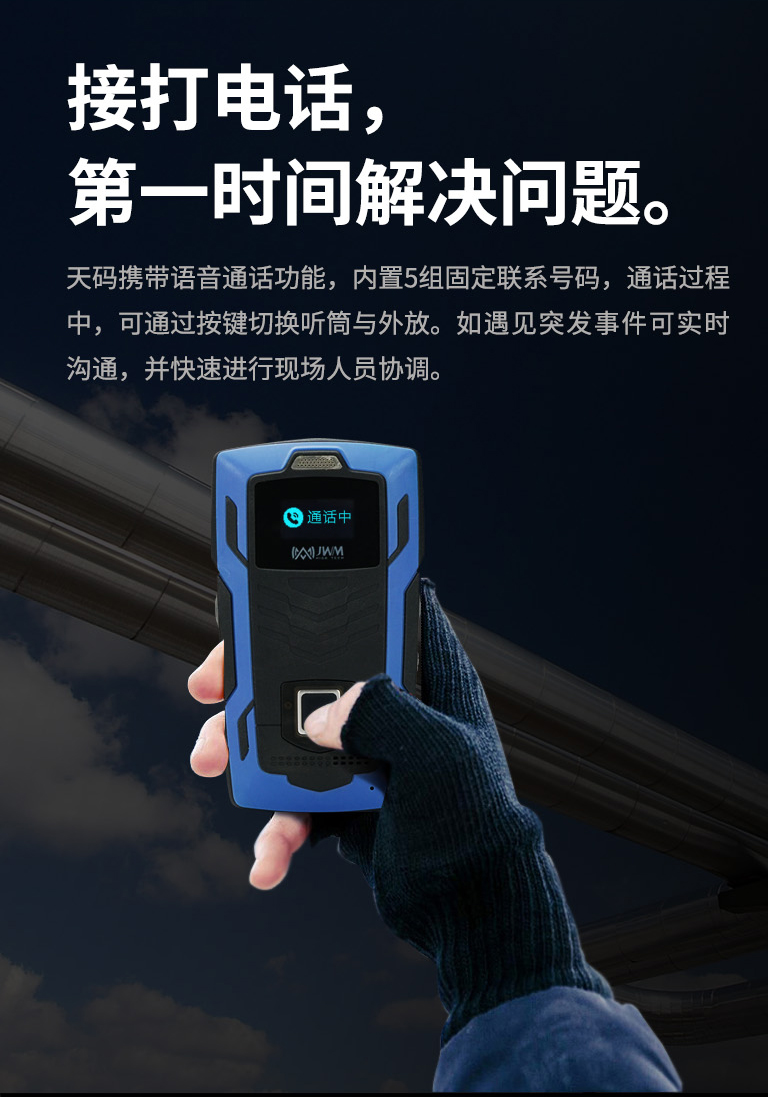 天碼攜帶語音通話功能,內(nèi)存5組固定聯(lián)系號碼,通話過程中,可通過按鍵切換聽筒與外放。如遇見突發(fā)事件可實時溝通,并快速進(jìn)行現(xiàn)場人員協(xié)調(diào)。